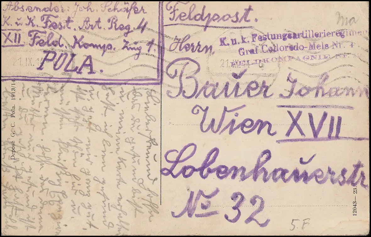 Feldpost Festungsartillerieregiment Graf Colloredo-Mels Nr. 4 - POLA 21.9.14