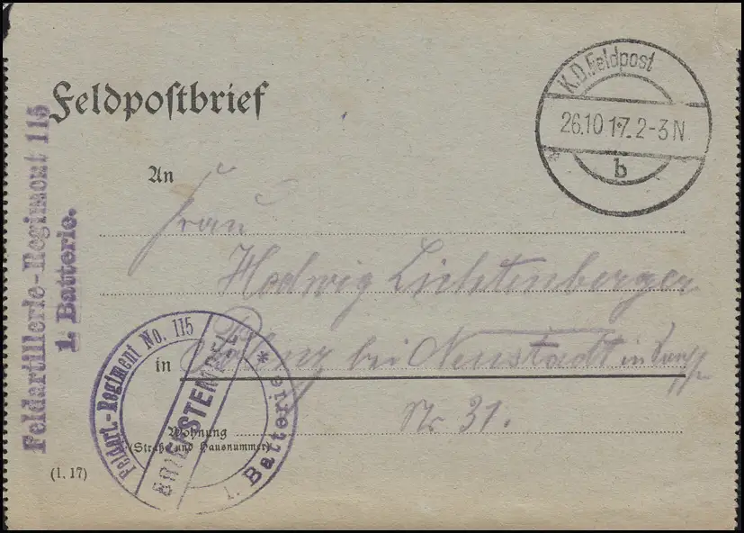 Feldpost-Kartenbrief Feldart.-Regiment 115 / 1. Batterie, K.D. FELDPOST 26.10.17