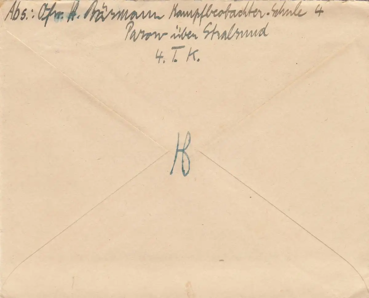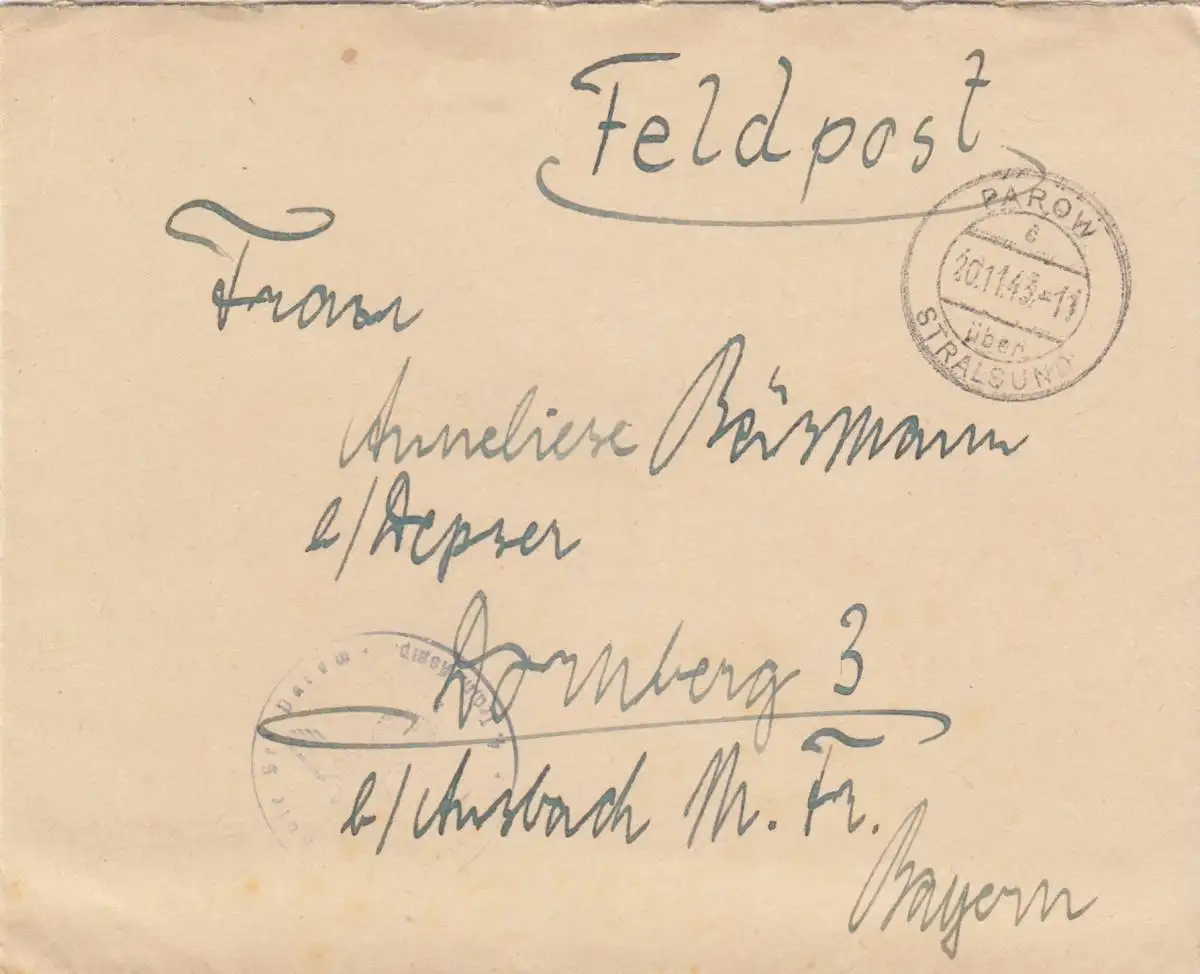 Feldpost Parow/Stralsund 1943 nach Dornsberg /Ansbach mit Briefinhalt,