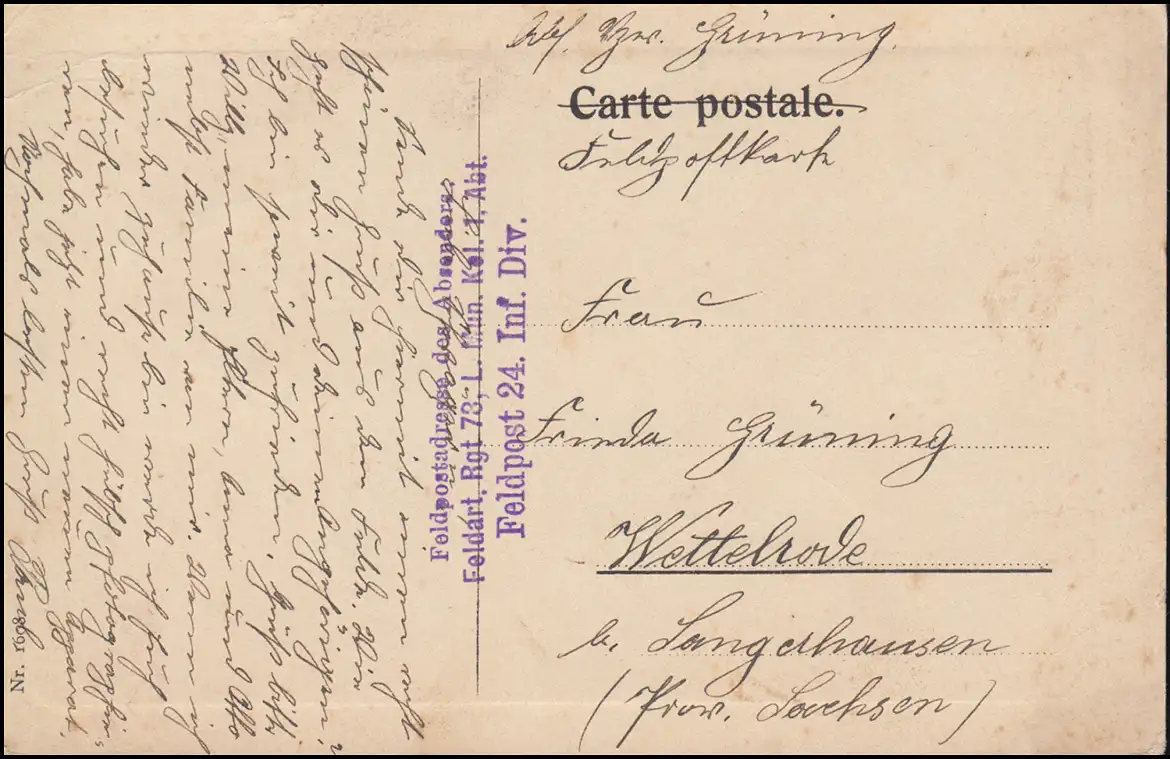 Feldpost S.B. Feldartillerie-Regiment 73 auf AK Fischer kehren zurück, um 1915