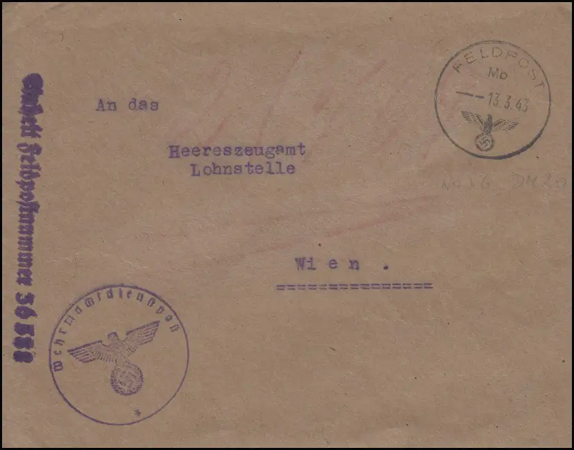 Feldpost Wehrmachtsdienstpost Feldpostnummer 36588 Brief FELDPOST Mb 13.3.43