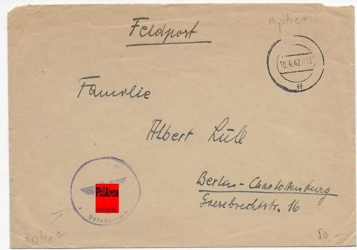 Feldpost: aptierter und stummer Stempel 1942 von FPNr. 42054