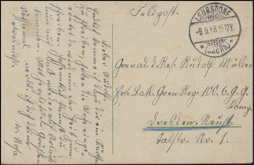 Feldpost auf AK Dein Glück Mein Wunsch, LEUBSDORF / SACHSEN 9.9.1918
