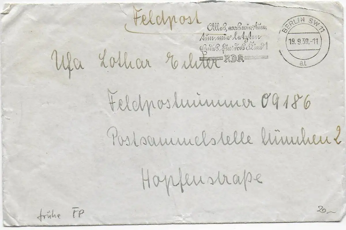Feldpost: frühe Feldpost 19.09.1939 Berlin an FPNr. 09186, Werbung Kinder