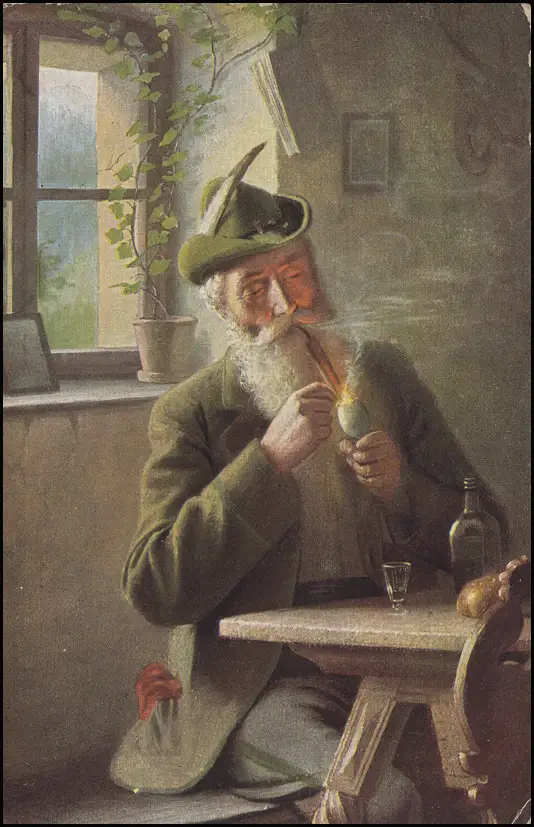 Feldpost mit BS 5.A.M.K. 16.A.K. FELDPOST 4.2.17 auf AK Gemälde Der Raucher