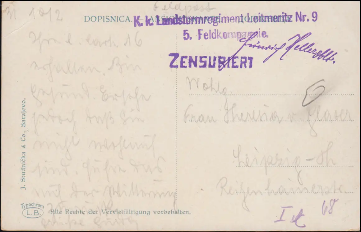 Feldpost und Zensur 5. Kompanie K. K. Landsturmregiment Leitmeritz Nr. 9 AK 1916