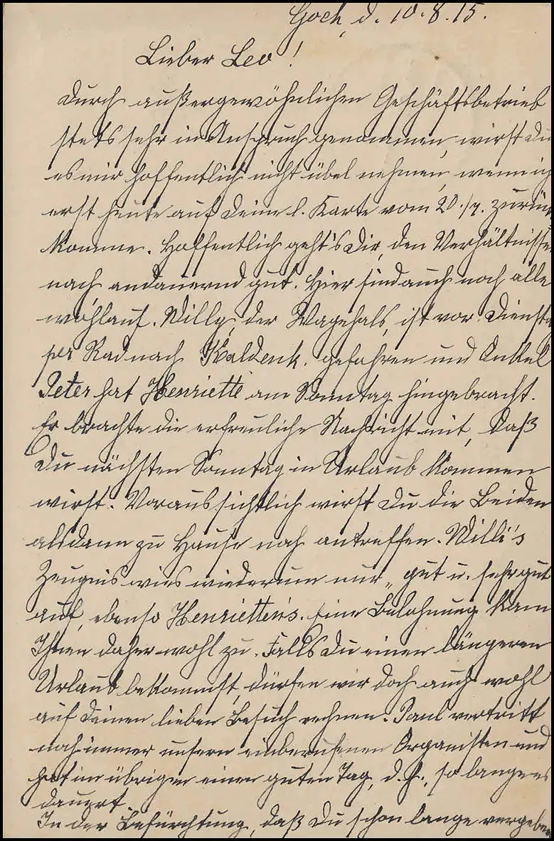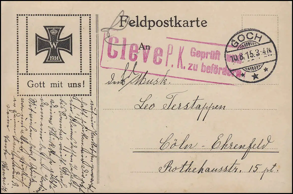 Feldpostkarte GOCH 10.8.15, roter Zensurstempel CLEVE P.K. geprüft/zu befördern