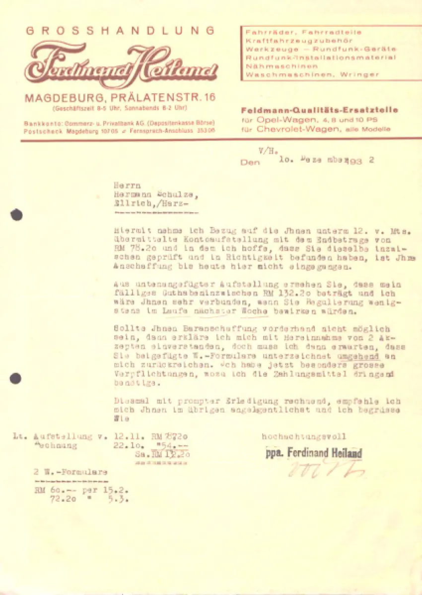 Ferdinand Heiland Fahrrad-Grosshandlung Schreiben 1932