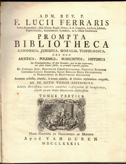 Ferraris, Lucius: Adm. Rev. P. F. Lucii Ferraris Prompta Bibliotheca canonica, juridica, moralis, theologica, nec non ascetica, polemica, rubricistica, historica, … in octo tomos distributa. Tomus Tertius [Ecclesia - Hypotheca, Pignus] Haga-Comitum [Den