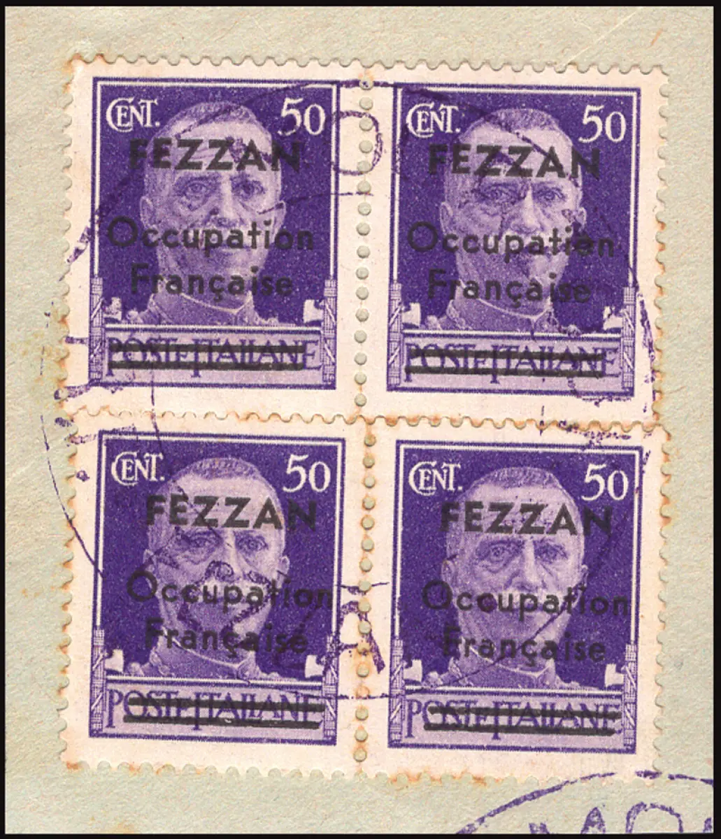 FRAGMENT - Fezzan Occ. Französisch - Kaiserreich Cent. 50 Nr. 1 vier Exemplare auf kleinem Umschlagfragment. Kat. euro 720 - Gebraucht Cod.1108/182