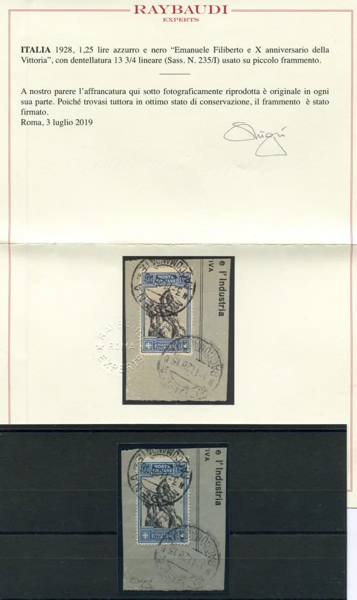 Filiberto Lire 1,25 Nr. 235/I Zahnung 13,3/4 linear wunderschönes gut zentriertes Exemplar auf annulliertem Umschlagfragment Modena 3.11.28 - Selten in diesem Zustand - Zert. Ray. - Kat. Euro 1.800 + Gebraucht für Sammler gebraucht original Cod. 25/15