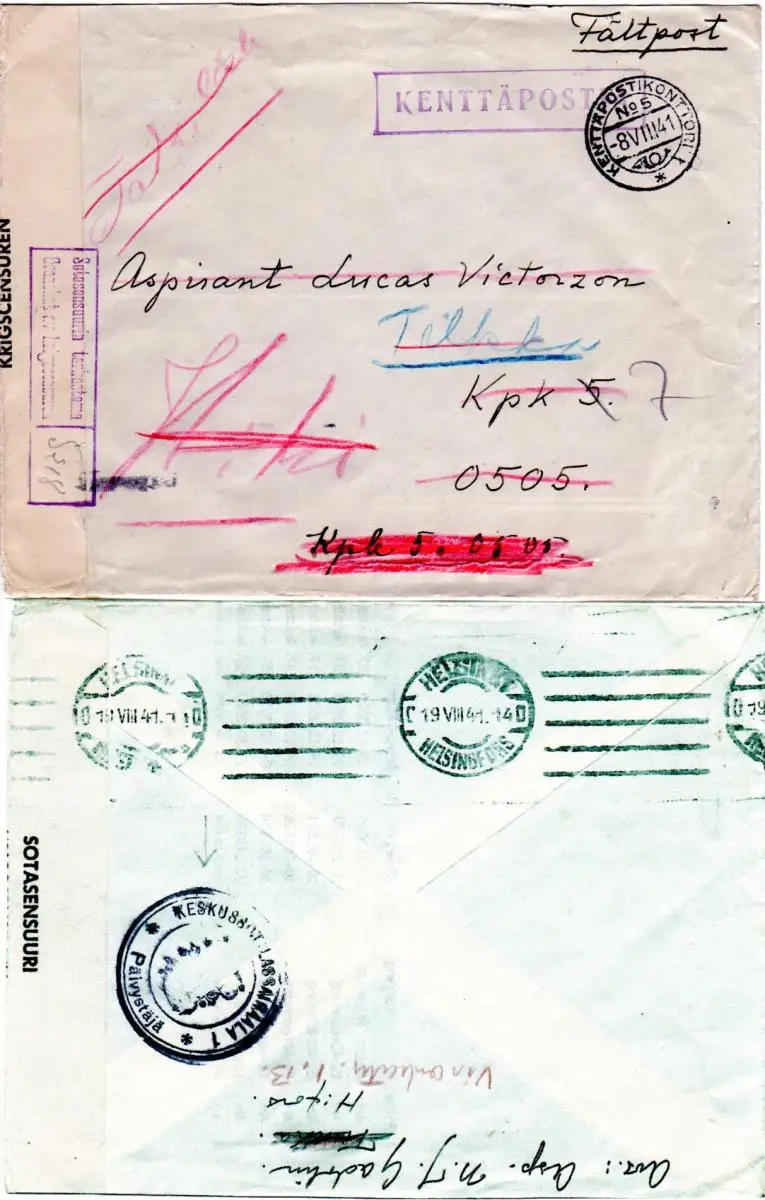 Finnland 1941, Feldpost Zensur Brief m. diversen Stempeln u. Nachsendung