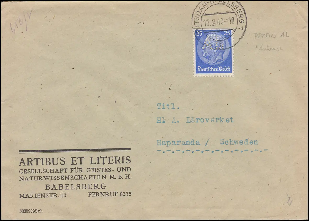 Firmenlochung AL auf 522 als EF auf Zensur-Brief POTSDAM-BABELSBERG 10.2.40