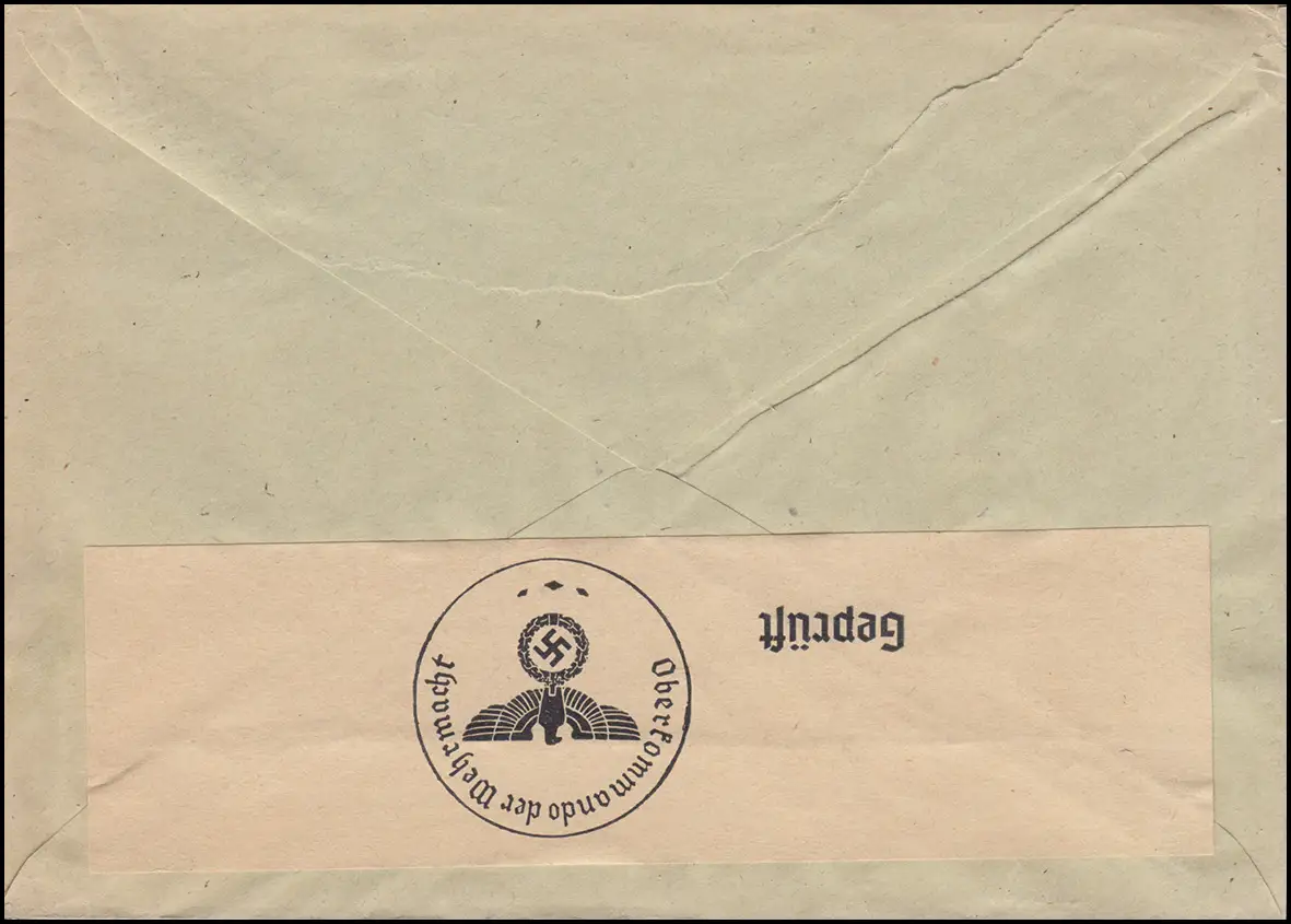 Portogerechte Einzelfrankatur auf Auslandsbrief der Firma Artibus et Literis Gesetllschafz für Geistes- und Naturwissenschaften mbH in Babelsberg als Zensurpost "Geprüft - Oberkommando der Wehrmacht" nach Schweden. Rollenmarke aus Automaten - siehe Zähnung.