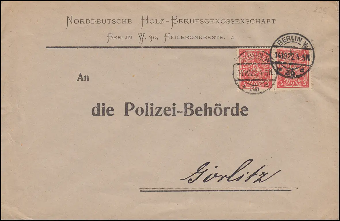 portogerechte Mehrfachfrankatur von der Norddeutschen Holz-Berufsgenossenschaft in Berlin W 30 auf Vordruck-Umschlag "An die Polizei-Behörde" in Görlitz