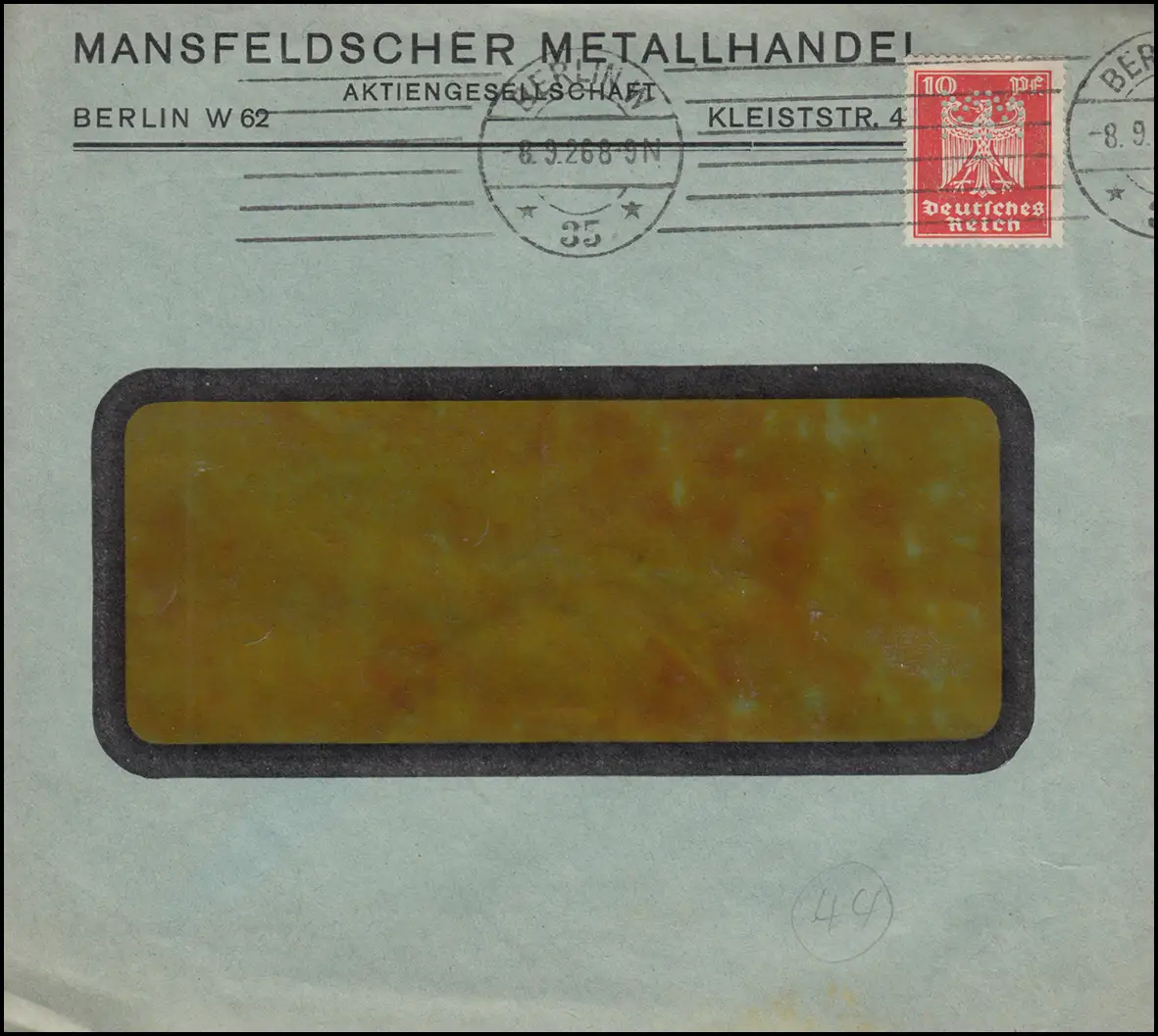 Firmenlochung MM auf 357 Adler 10 Pf. als EF auf Fensterbrief BERLIN 8.9.26