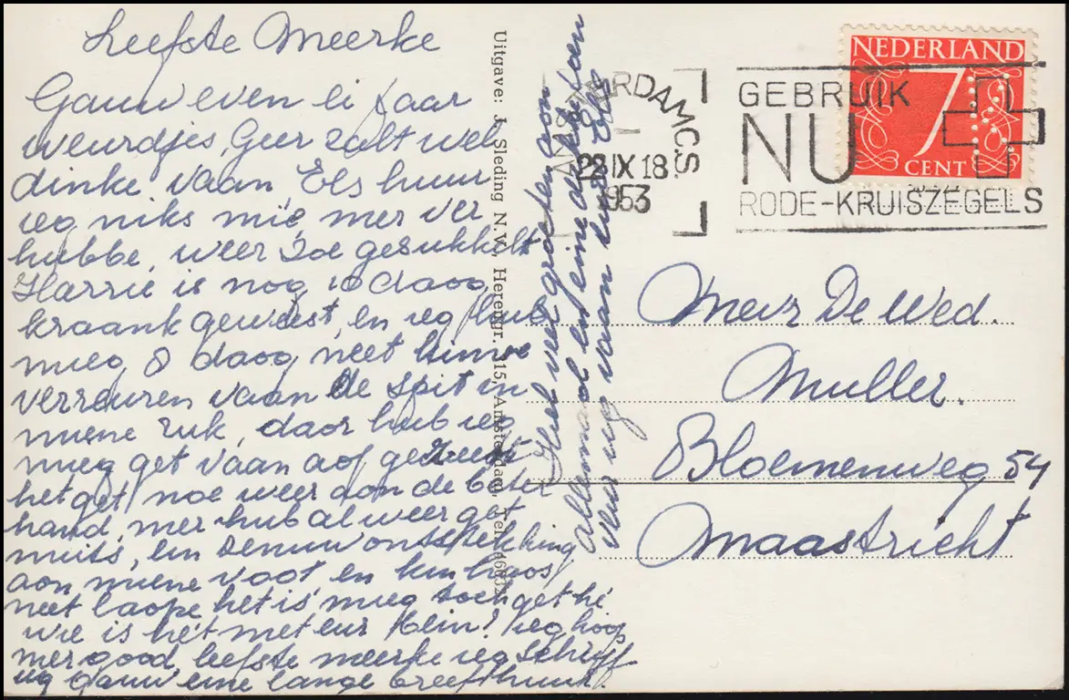 Firmenlochung/Perfin K auf 614 Ziffer auf AK Grüße aus AMSTERDAM 22.9.53