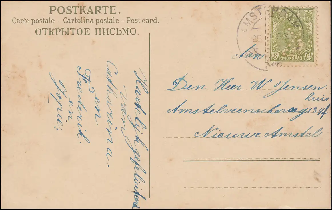 Firmenlochung/Perfin K auf 67 Wilhelmina auf AK Gemälde, AMSTERDAM um 1920