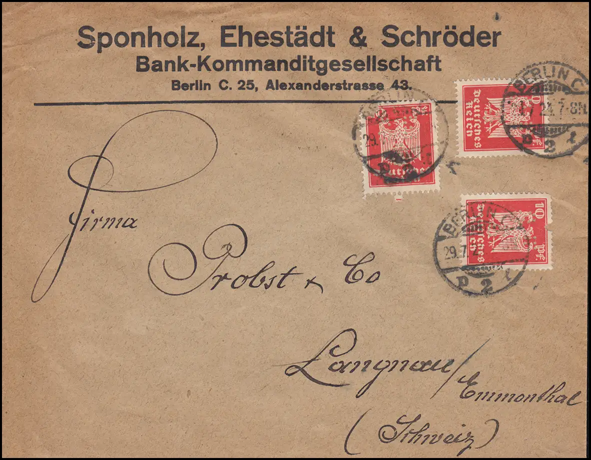 portogerechter schwerer Auslandsbrief von der Bank-Kommanditgesellschaft Sponholz, Ehestadt und Schröder in die Schweiz, Ankunftsstempel LANGNAU i.E. 31.7.24, Frankatur teils defekt laut Abbildung