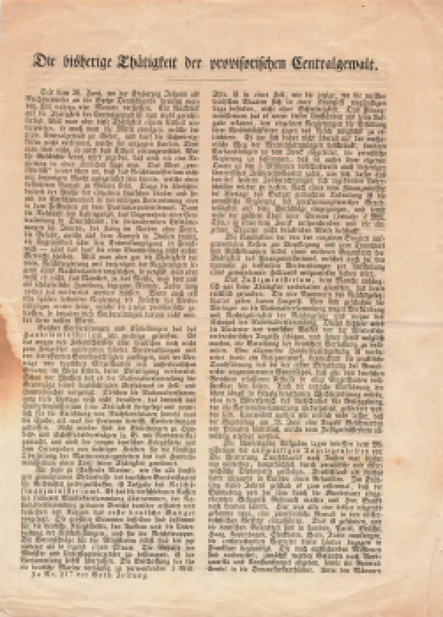 Flugblatt zur provisorischen Centralgewalt um 1848"Die bisherige Thätigkeit der provisorischen Centralgewalt ca. A4