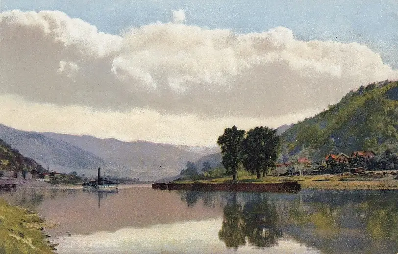 Flußlandschaft mit Dampfer. Wer kennt sie? ngl E0669