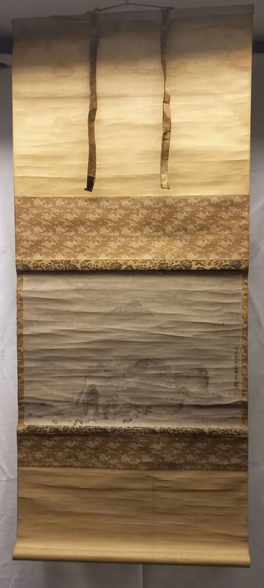 Bemerkungen: Japanese paper hanging scroll with a fogggy mountain landscape.