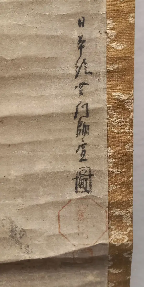 Japan. Antique hanging paper scroll. Bordered with a silk and silk brocade. Heigth 47, 2". Width 20, 6" (ca. 120 x 52, 5 cm.). Roller ends missing. Rubbed, folding lines visible, some stains in the upper part.