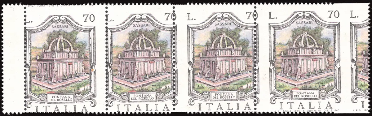 MNH - Vollgummi - - Fontane Lire 70 Sassari Nr. 1311 horizontaler Streifen von vier Exemplaren, die sich alle durch fehlerhaften Vorschub des Bohrkammes voneinander unterscheiden, wobei ein Exemplar viel breiter und teilweise nicht horizontal gezahnt ist, einer viel schmaler, einer mit Doppelverzahnung links mit teilweiser horizontaler Doppelverzahnung - auffällig, unserer Meinung nach können es nur 5 Streifen wie diesen geben - Gebraucht Cod.687/182