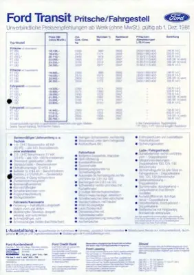 Ford Transit Pritsche / Fahrgestell Preisliste 1982