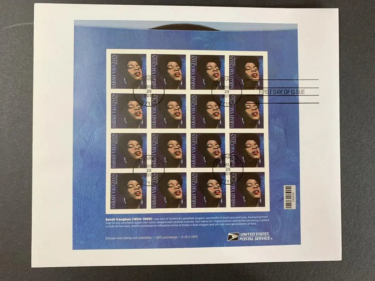 Forever USA 2015: FDC with sheet of Sarah Vaughan 16 stamps #5059