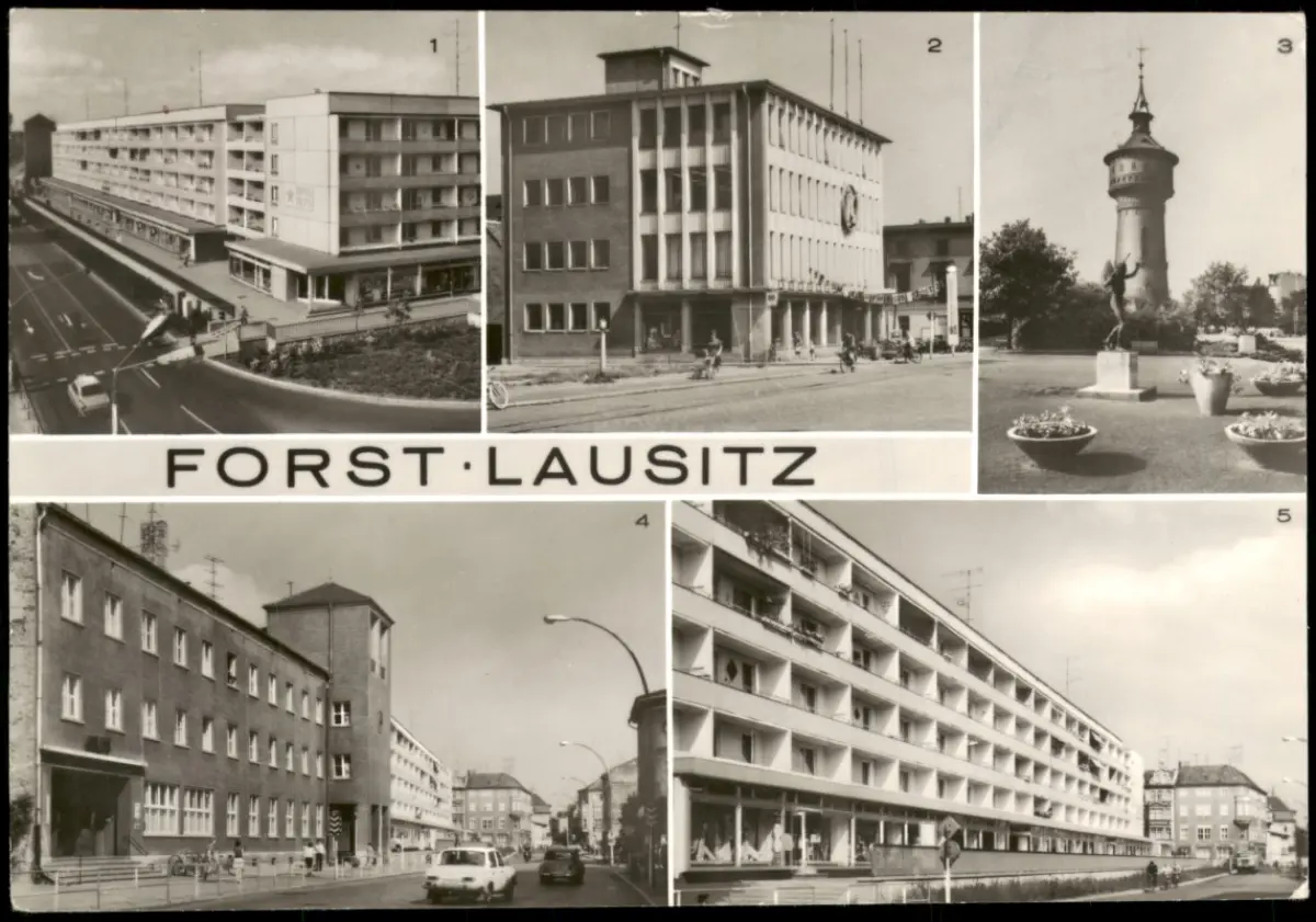 Forst (Lausitz) Baršć Berliner Straße, Konsum-Kaufhaus, Wasserturm, Post 1983