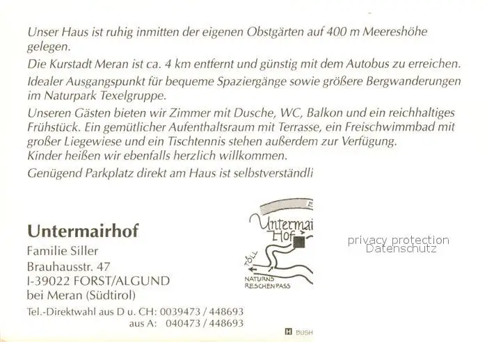 Forst_Meran Gaestehaus Pension Untermairhof Swimming Pool Forst_Meran postalisch nicht gelaufen nach 1965 Werbekarte (keine Postkarte) Erhaltung siehe scans [FriedD77] Werbekarte (keine Postkarte) Frierer