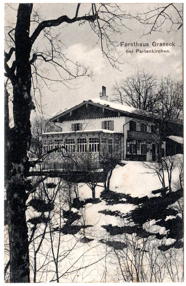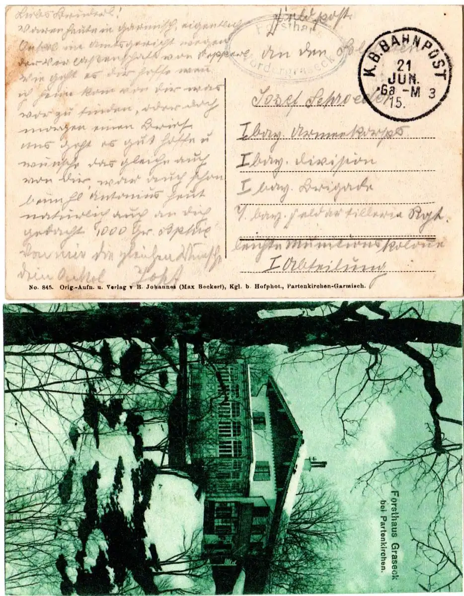 Forsthaus Graseck b. Partenkirchen, 1915 m. Bahnpost Ga-M3 gebr. Feldpost sw-AK