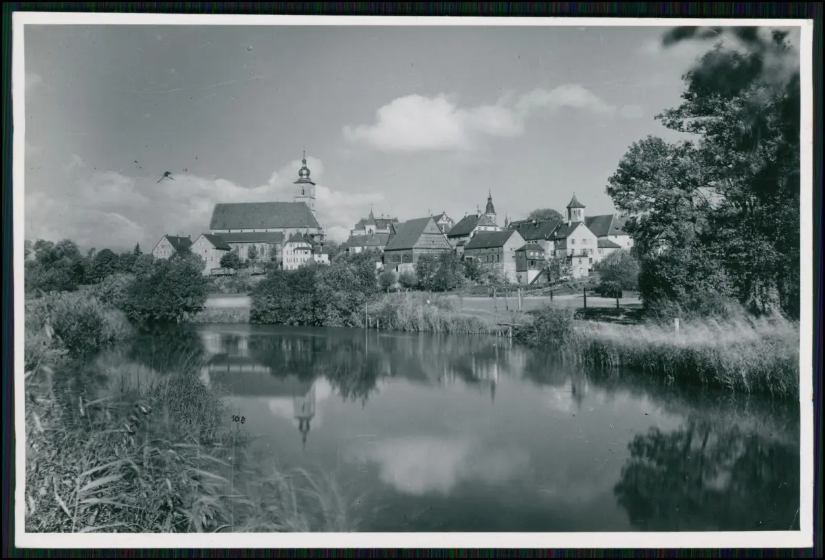 Die Fotografie zeigt den historischen Stadtkern mit der markanten Stadtkirche St. Johannes Baptist (erbaut im 14. Jahrhundert, und den typischen fränkischen Fachwerkhäusern.