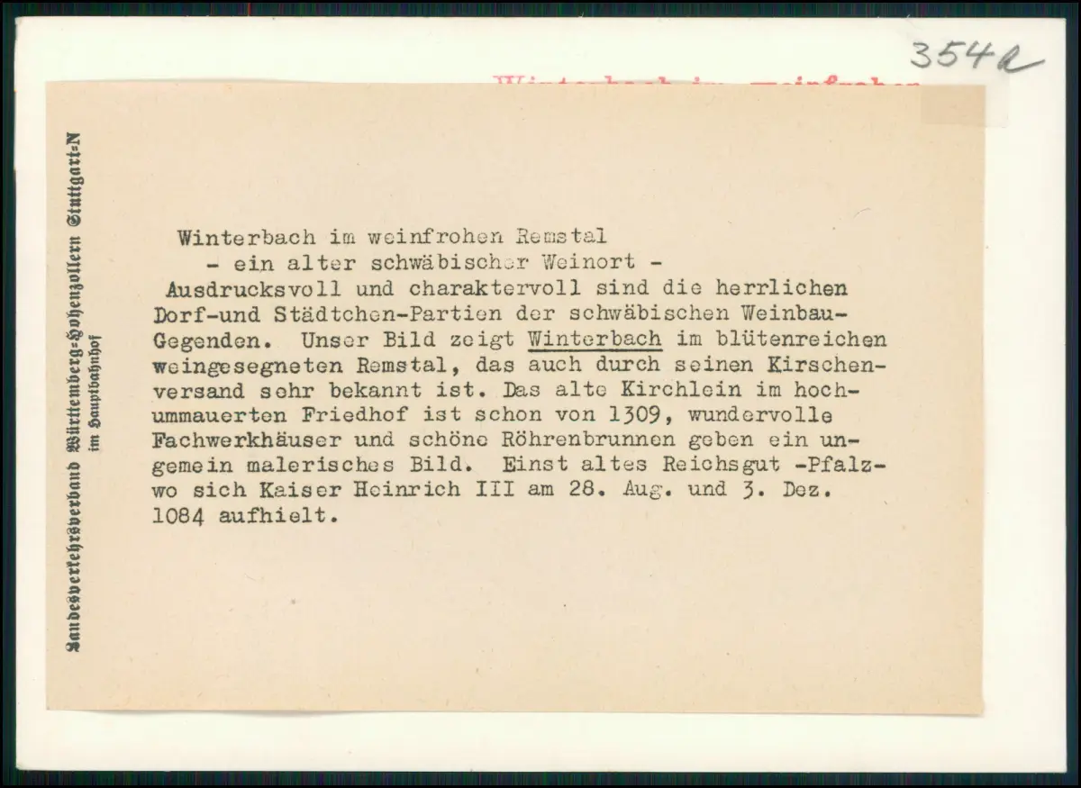 Winterbach liegt im fruchtbaren Remstal in Baden Württemberg und ist ein traditionsreicher Weinort. Die Aufnahme zeigt den zentralen Marktplatz mit dem eindrucksvollen Brunnen, umliegenden Fachwerkhäusern und der charakteristischen Kirche.