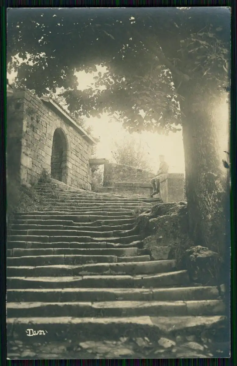 Foto AK 1. WK Dun an der Maas Deutscher Soldat Rast Treppe bei der Kirche 1915