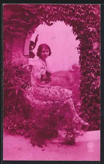 Foto-AK A. Noyer Nr. 1528: Fräulein mit Rosen sitzt vor Tor