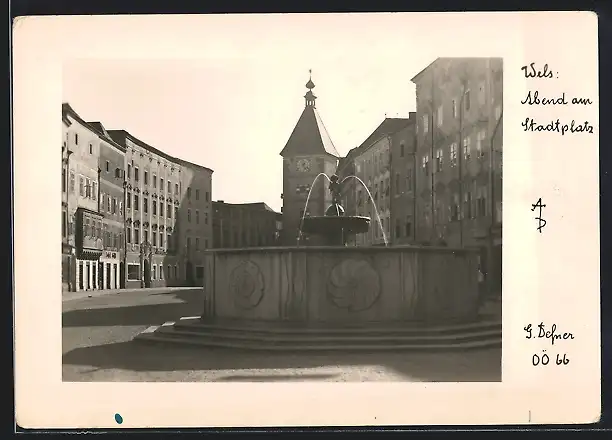 Foto-AK Adalbert Defner: Wels, Abend am Stadtplatz mit Brunnen