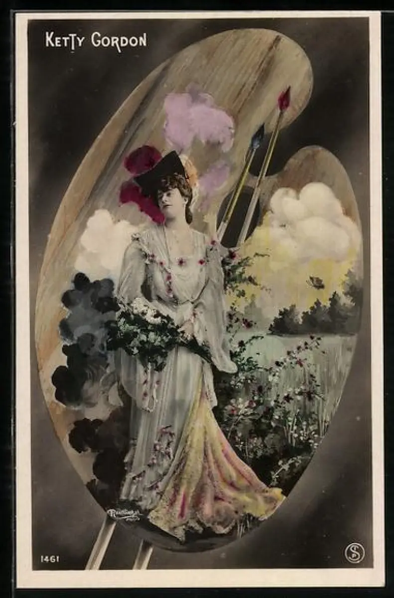 Foto-AK Atelier Reutlinger, Paris 1461: Ganzportrait Ketty Gordon im Kleid vor Malerpalette