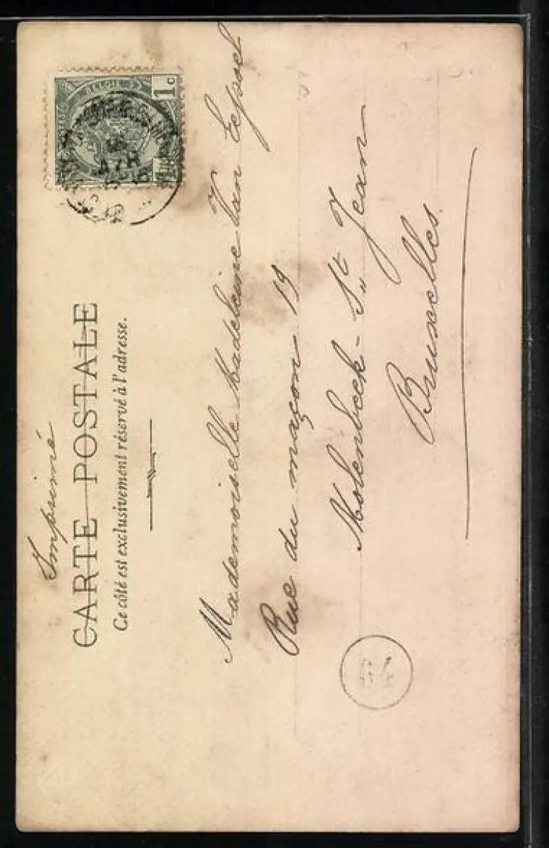 Personenbezogene Daten auf der Rückseite der Karte wurden durch blauen Textmarker unkenntlich gemacht. Die blauen Stellen sind auf die Vorderseite durchgeweicht und wirken sich negativ auf das Postkartenfoto aus