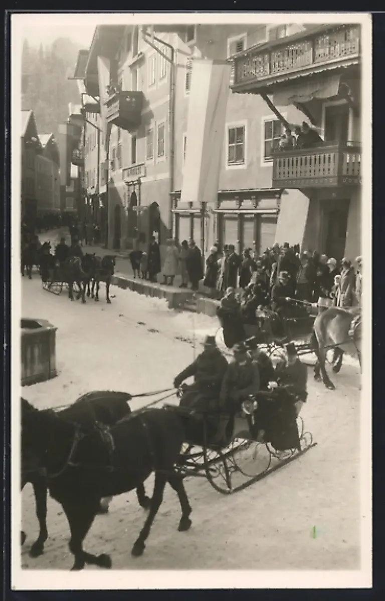 Foto-AK Berchtesgaden, Marktplatz mit Pferdeschlitten im Winter