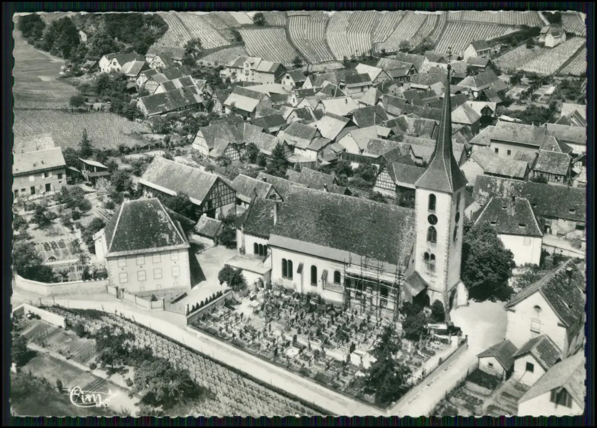 Motiv: Kirche Saint-Remi mit Friedhof und umliegenden Fachwerkhäusern, Luftaufnahme