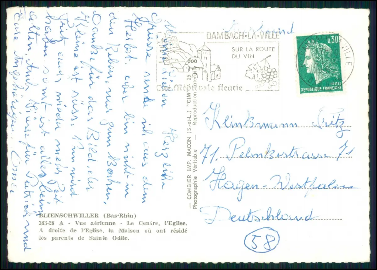 Rückseite: Gelaufen nach Hagen (Westfalen), mit 0,30 Fr. Marianne-Briefmarke, Stempel Dambach-la-Ville