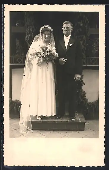 Foto-AK Brautpaar mit Blumenstrauss auf einem Podest