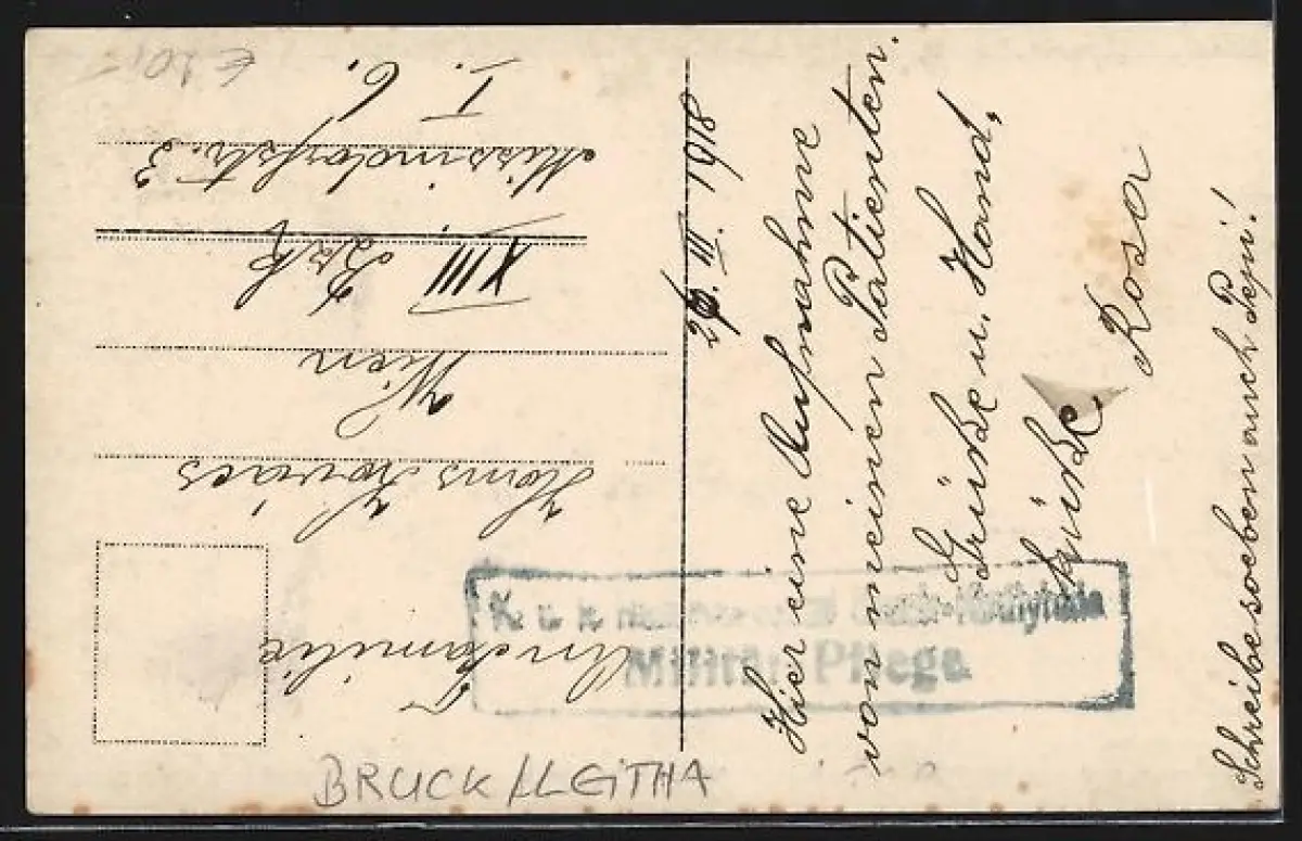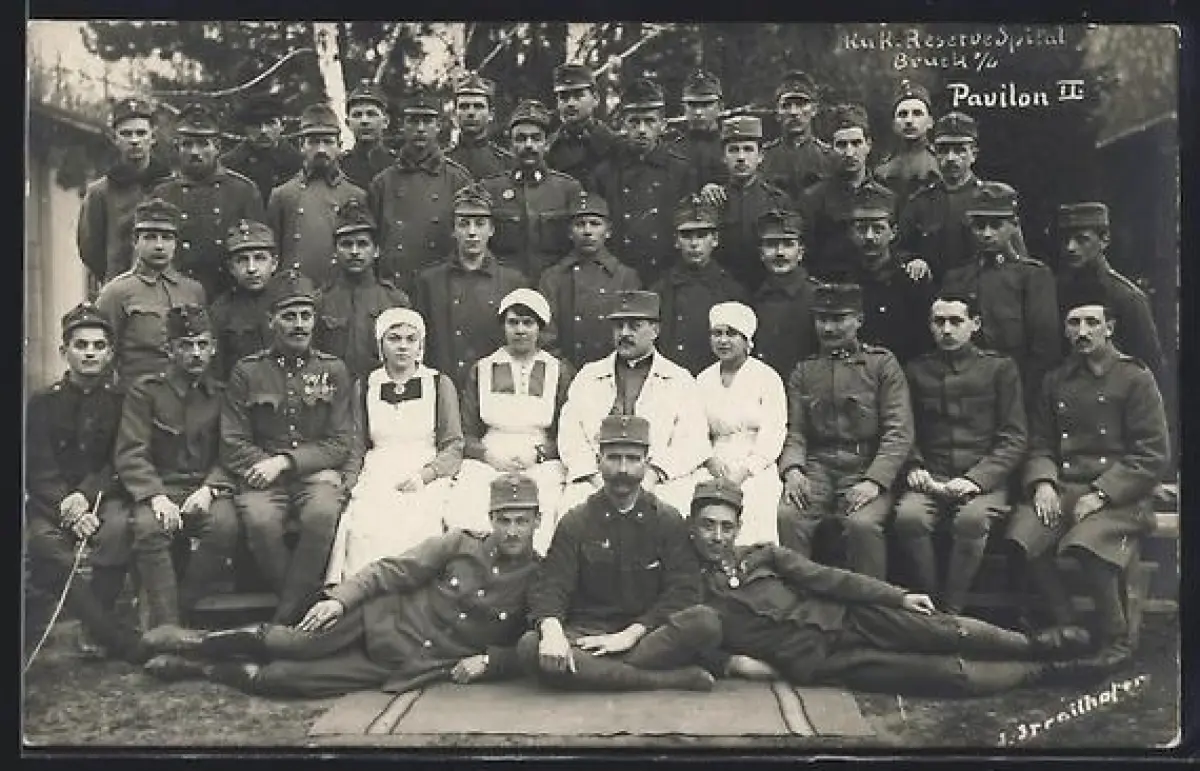 Foto-AK Bruck /Leitha, Soldaten und Schwestern d. Reserve-Spital, Pavilon II