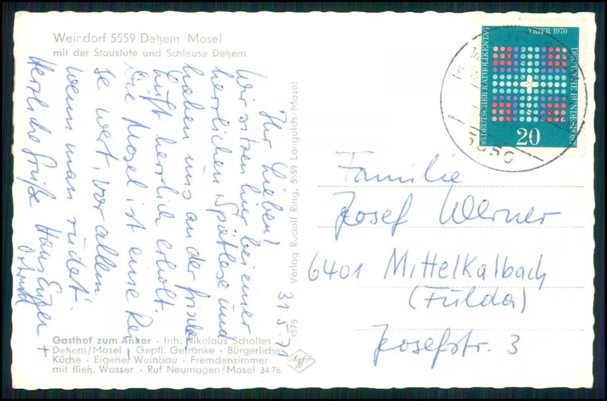 Mit handschriftlichem Urlaubsgruß, frankiert mit 20-Pfennig-Bundespost-Marke „Katholikentag 1970“, sauberem Stempel 31.5.1970. Adressiert nach Mittelkalbach (Fulda). Hersteller: Agfa, Seriennummer 1575.