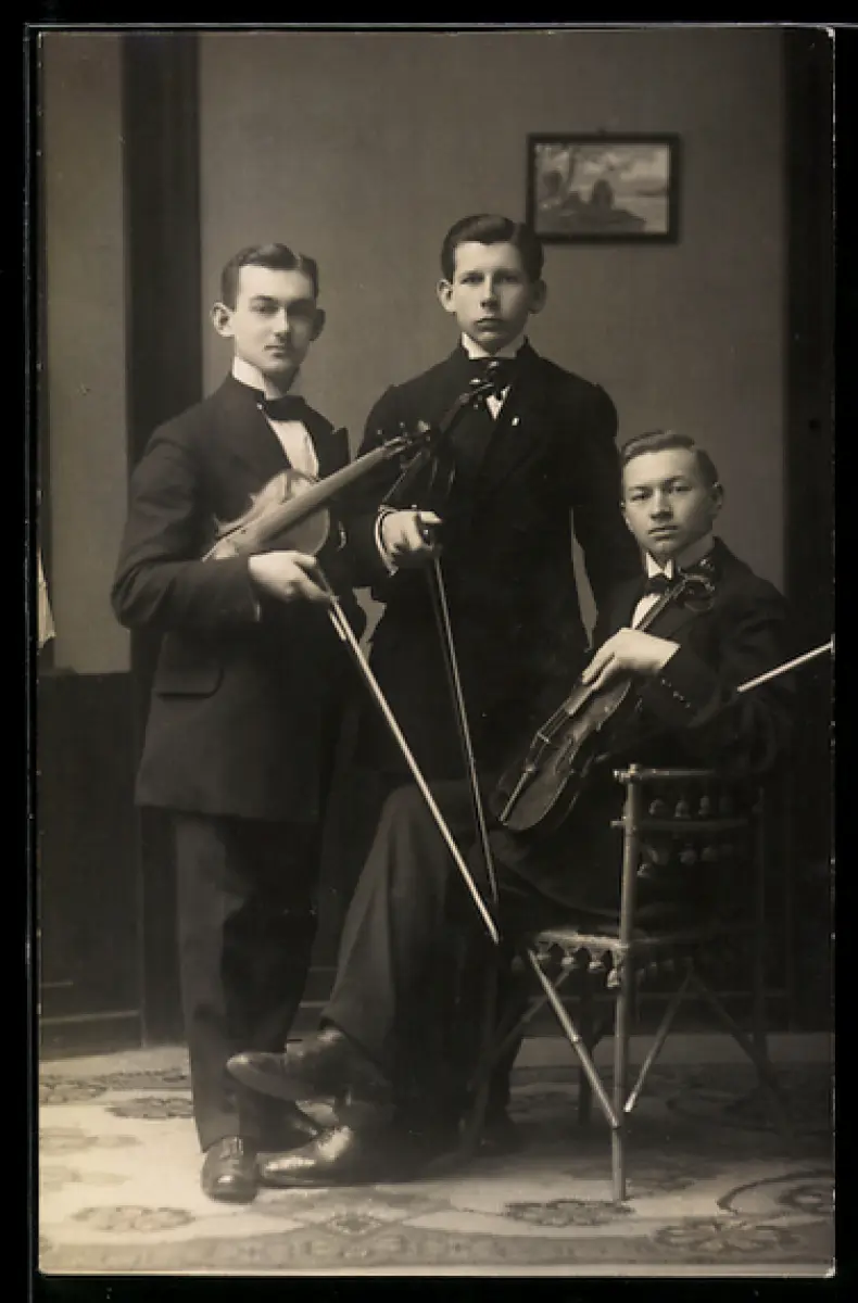 Foto-AK Drei Geiger mit Instrumenten, Portrait