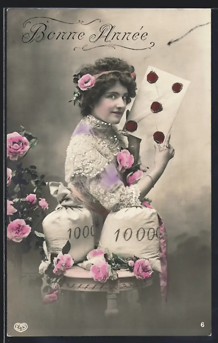 Foto-AK EAS Nr. 6: Frau mit Kuvert und Geldsäcken, Neujahrsgruss