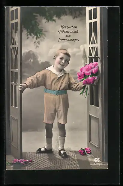 Foto-AK EAS Nr. 7085 /3: Knabe stht mit einem Blumenstrauss in einer Tür
