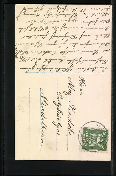Personenbezogene Daten auf der Rückseite der Karte wurden durch blauen Textmarker unkenntlich gemacht. Die blauen Stellen sind auf die Vorderseite durchgeweicht und wirken sich negativ auf das Postkartenfoto aus